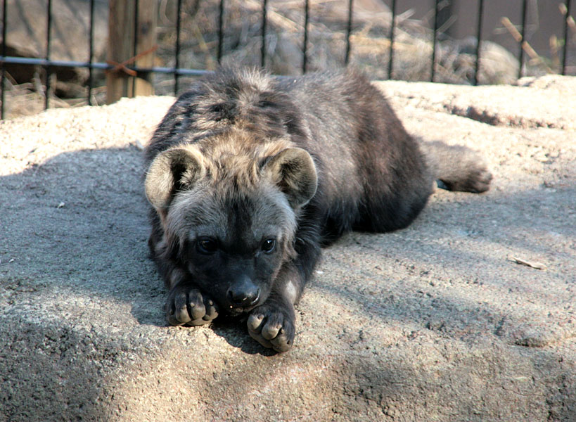 ブチハイエナの子供。黒くて、頭が大きく、まるで子犬のようです。(大阪天王寺)