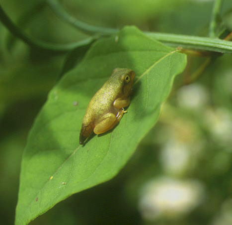 水の中から出てきてまもないアマガエル。おたまじゃくしのなごり、しっぽがまだついています。